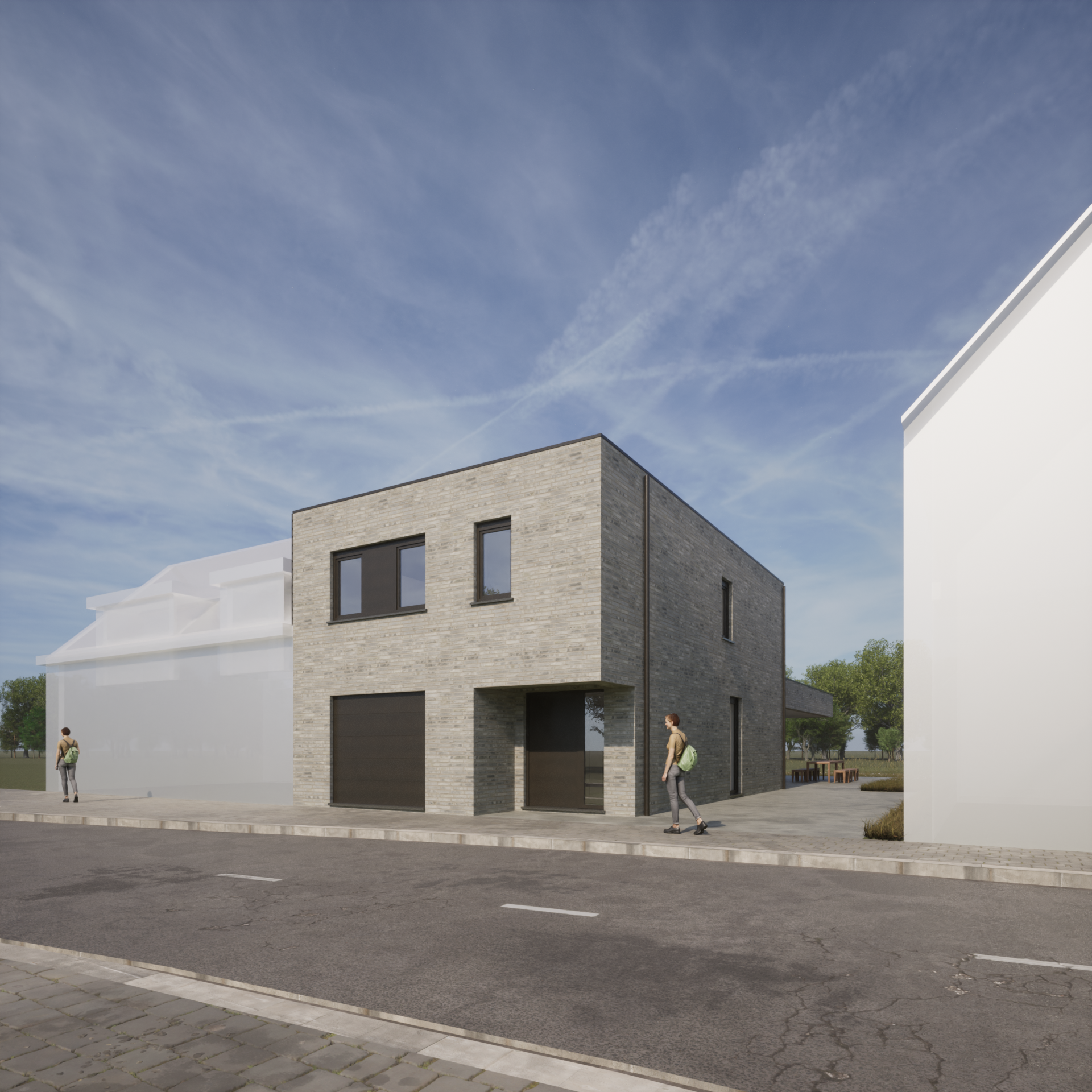 Een halfopen bebouwing langs een straat in het centrum van de gemeente vormt een nieuwe, compacte woning voor een jong gezin.