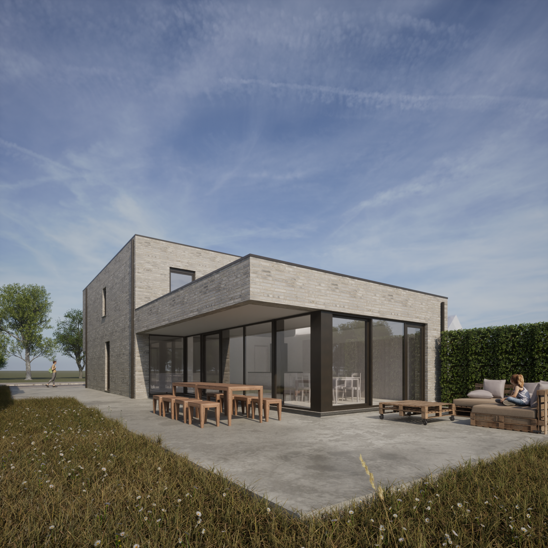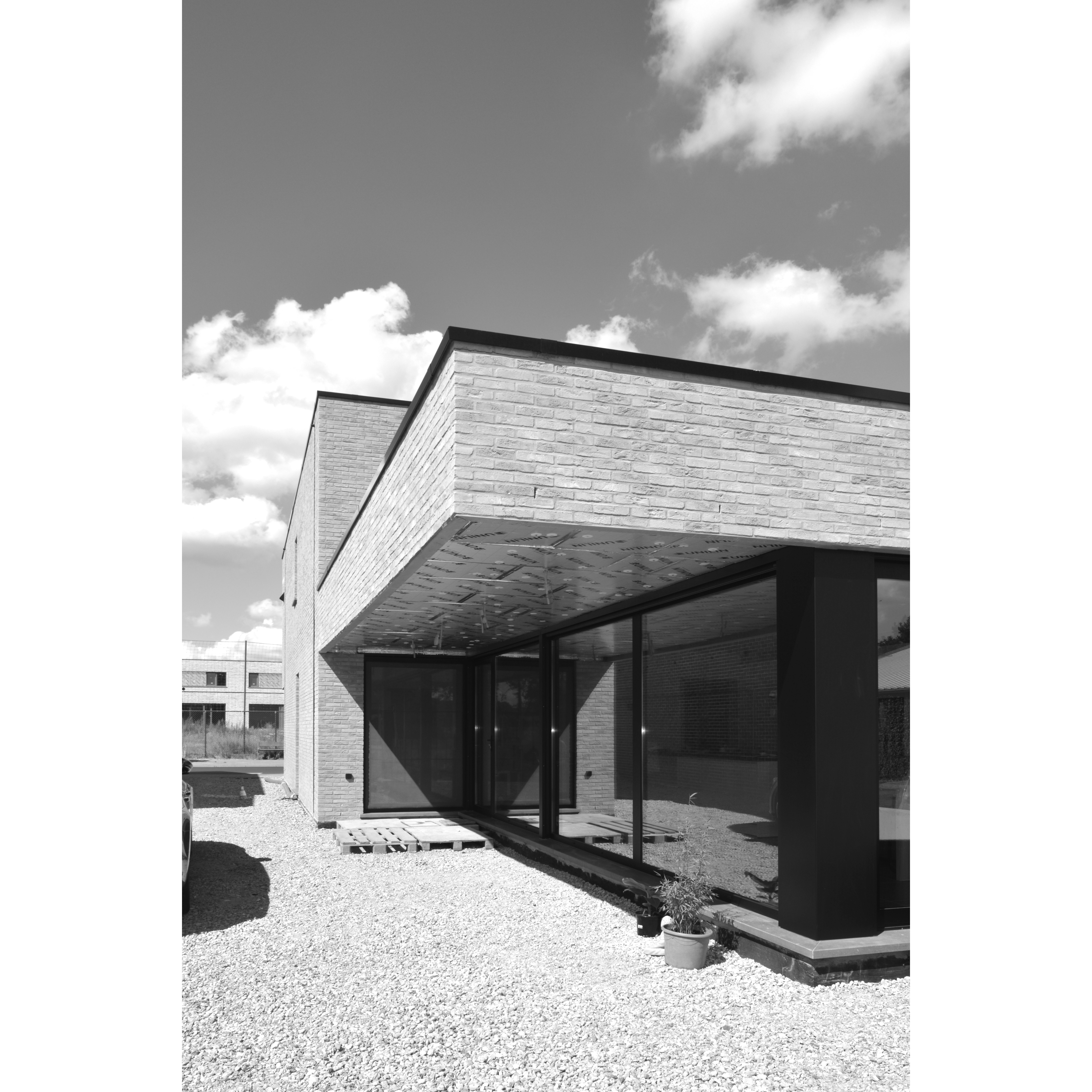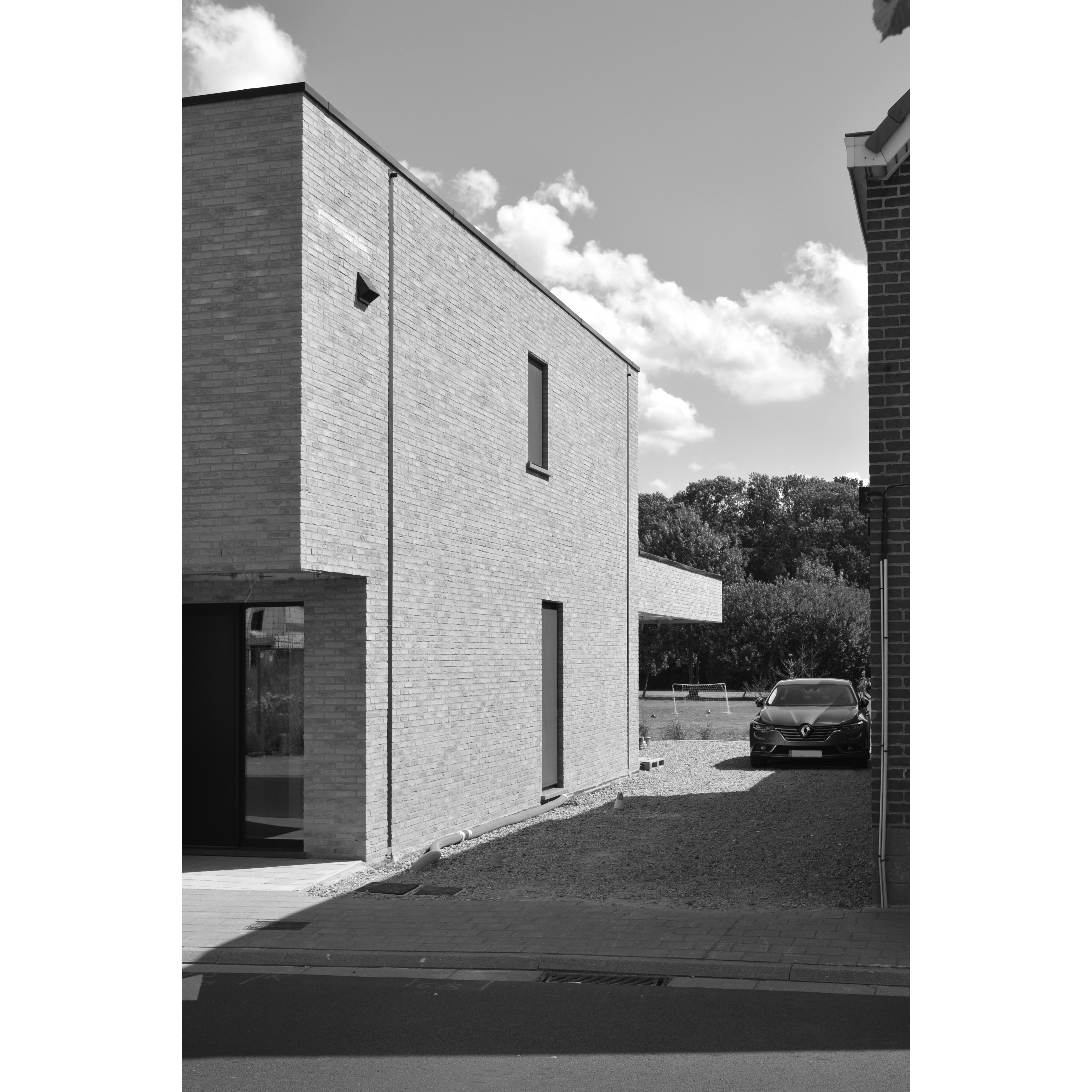 Aan de straatzijde vormt een vooral gesloten volume een intieme plek voor de woonfuncties die dit vereisen.