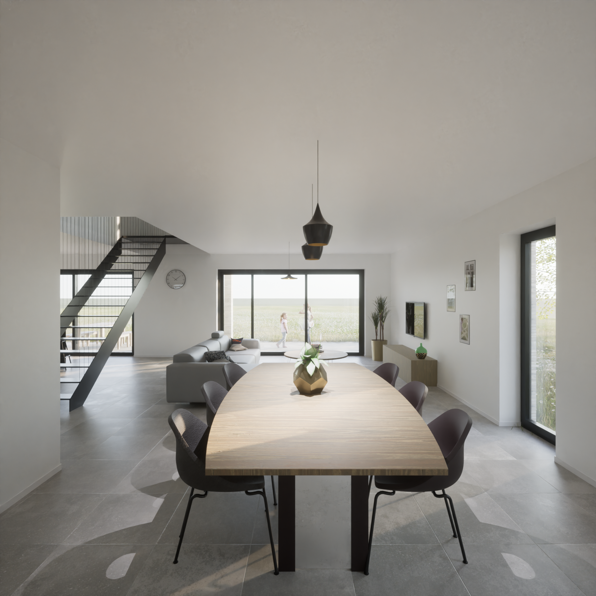 Dit benadrukt en versterkt de diepte van het perceel en de relatie met de tuin en het landschap.