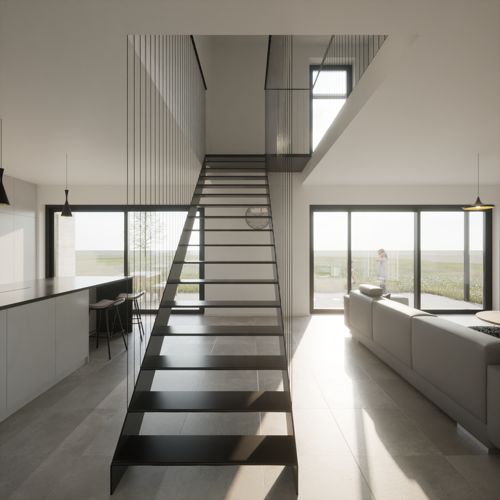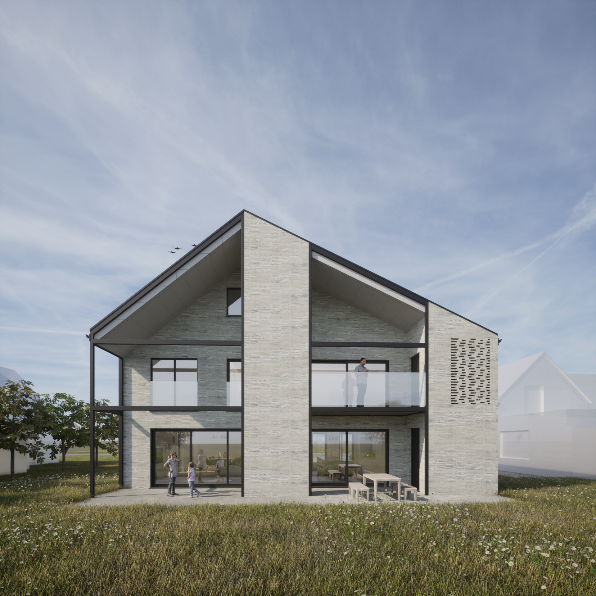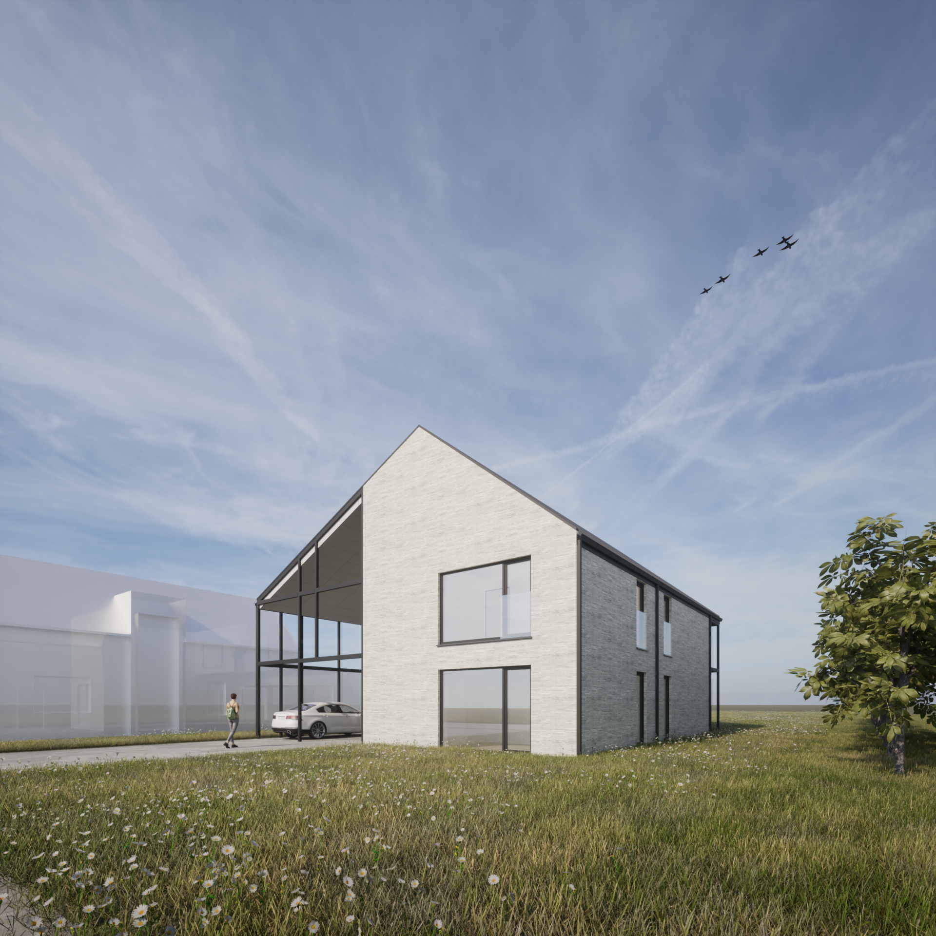 Het ontwerp zoekt een maximaal uitzicht en contact naar het landschap, met een sterke openheid aan de achtergevel en voorgevel terwijl de zijgevels een heel gesloten karakter hebben. De gesloten technische functies worden heel doelbewust een plaats gegeven op een manier die de openheid in de richting van het perceel maximaal ondersteunt en tegelijk voor privacy zorgt richting de buren.